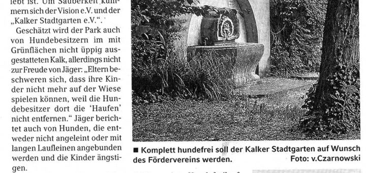 Verein fordert Hundeverbot im Kalker Stadtgarten Kalk (ac). Über „Tretminen“ klagt Robert Jäger, Spielplatzpate und Vorsitzender des „Kalker Stadtgarten e.V.“. Der Spielplatz nimmt viel Raum ein im kleinen Park, der jahrelang ein zugewachsenes Schattendasein...