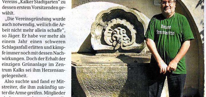 Neuer Verein „Kalker Stadtgarten“ e.V. gegründet Kalk (pas). Zwölf engagierte Kalker fanden sich zusammen, um die kleine Parkanlage an der Kalker Hauptstraße unter ihre Fittiche zu nehmen. Der langjährige Spielplatz- und Parkpate Robert Jäger...