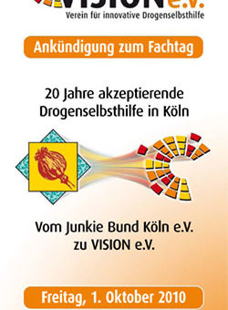 20 Jahre akzeptierende Drogenselbsthilfe in Köln Vom Junkie Bund Köln e.V. zu VISION e.V. VISION e.V. kann in diesem Jahr bereits sein 20–jähriges Bestehen feiern. Zu diesem Anlass veranstalten wir am Freitag, den 1....