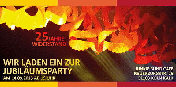 Jubiläumsempfang „25 Jahre Widerstand“ Montag, den 14.9.2015 im Gürzenich Köln Mit einem großen Empfang feiern JES, VISION und akzept (als Mitherausgeber des alternativen Drogen- und Suchtberichts) gemeinsam ihr 25-jähriges Bestehen. Uns vereint die Überzeugung,...